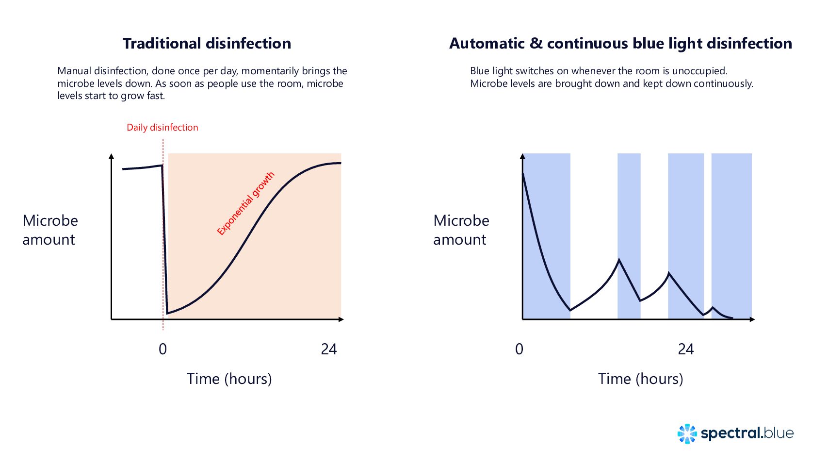 Spectral Blue is the world’s most advanced system for indoor surface disinfection. It helps prevent infections and reduce sick leave in workplaces by automatically and continuously eliminating pathogens from frequently touched surfaces, making your premises safe for staff and customers.